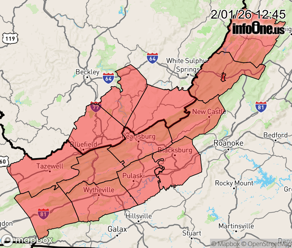 Canceled 2/1/26 7:57 PM Cold Weather Advisory issued February 1 at 12:44PM EST until February 2 at 9:00AM EST by NWS Blacksburg VA * WHAT... Very cold wind chills as low as 10 below expected. * WHERE... Portions of southwest and west central Virginia and southeast West Virginia. * WHEN... From 6 PM this evening to 9 AM EST Monday. * IMPACTS... The cold wind chills as low as 10 below zero could result in hypothermia if precautions are not taken. ![]() |