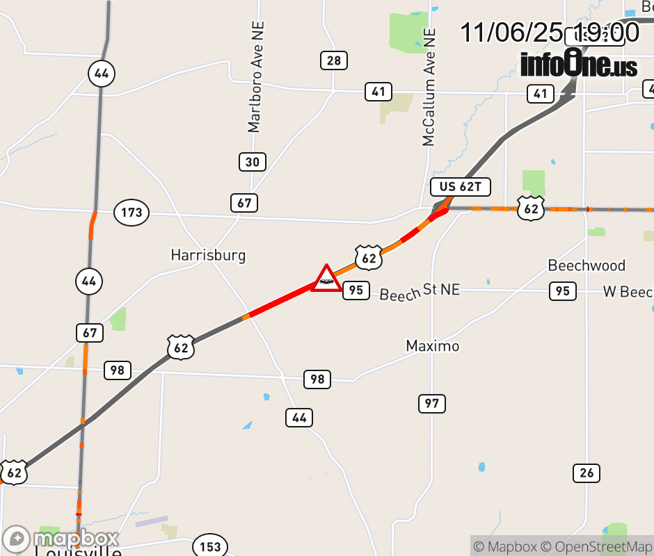 The left lane is blocked on US-62 East at Beech St Ne all lanes are closed on US-62 West at Beech St Ne, due to a crash. ![]() |