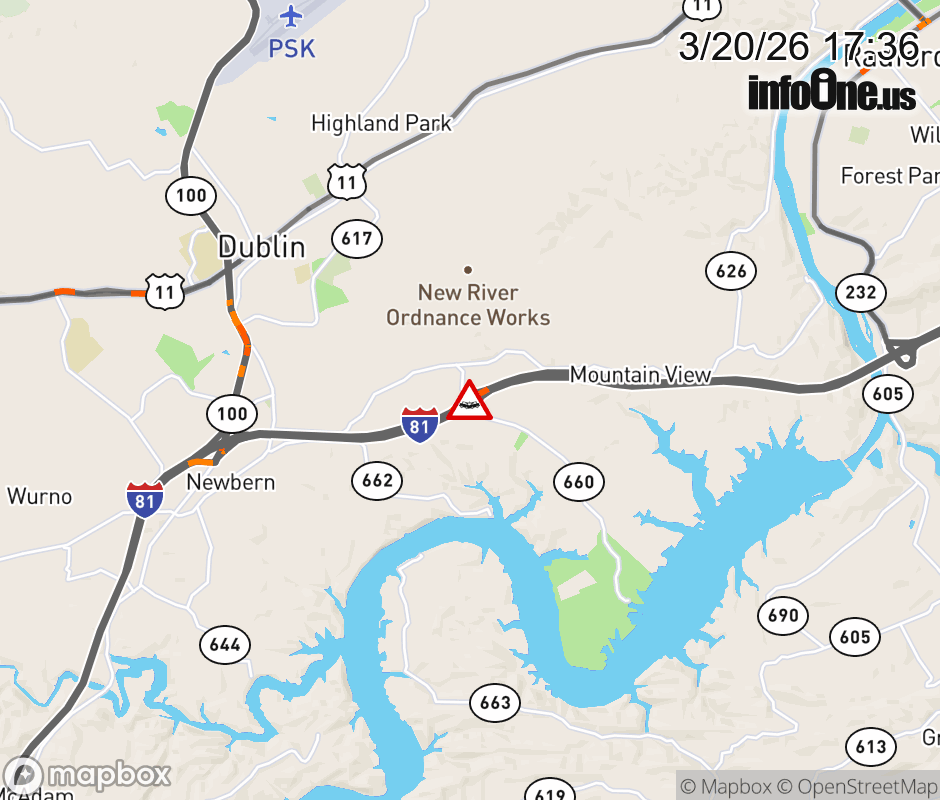 On I-81 at mile marker 101.1 in the County of Pulaski, motorists can expect delays due to a vehicle crash. The south right shoulder is closed. ![]() |