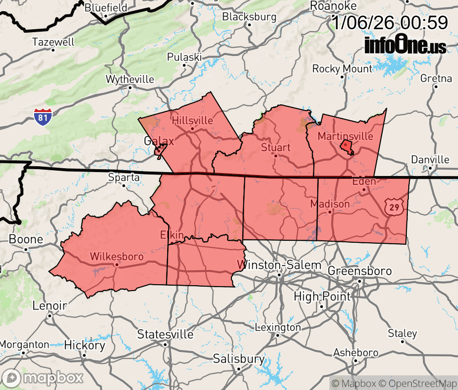 Canceled 1/6/26 4:00 AM Special Weather Statement issued January 6 at 12:57AM EST by NWS Blacksburg VA Fog has developed across the foothills and Piedmont of North Carolina into the foothills of Virginia. Fog could become locally dense, with visibilities under a half mile. This will impact travel, especially along I-77 between Yadkinville and Hillsville, and I-74 between Mount Airy and the Triad. If driving, be prepared for sudden reductions in visibility. Slow down, use low-beam headlights, and leave extra space between vehicles. ![]() |