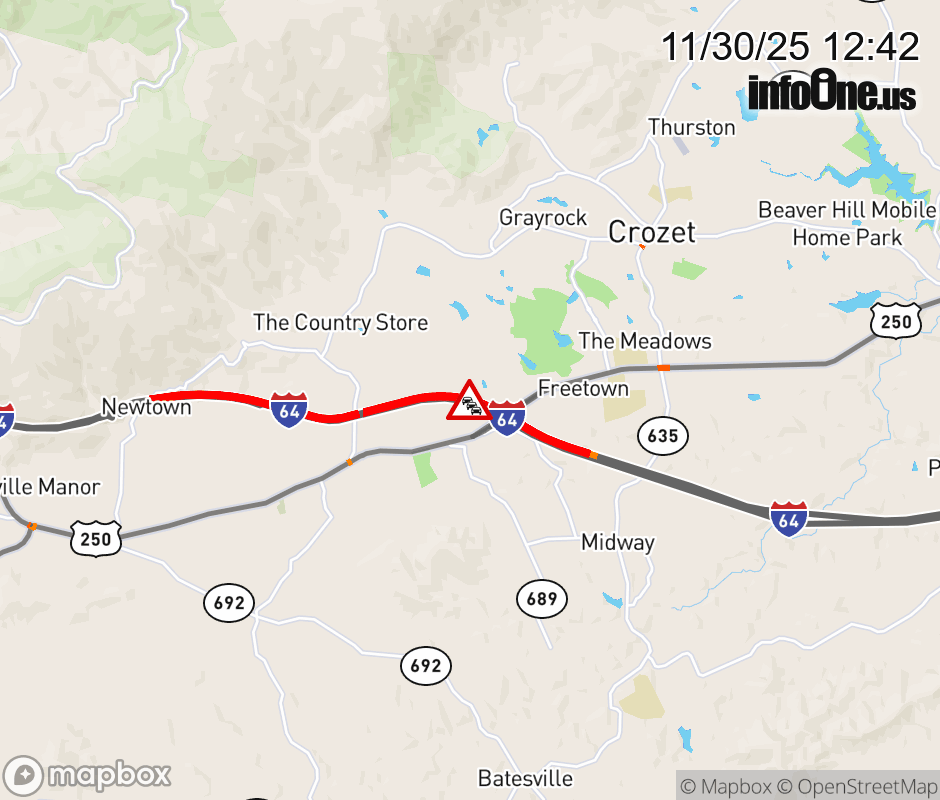 On I-64 West at mile marker 107 in the County of Albemarle, motorists can expect delays due to congestion. Traffic backups are approximately 2.5 miles. ![]() |