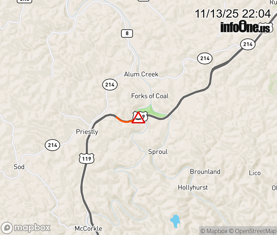 Vehicle Crash on US-119/Little Coal River Rd. The northbound right lane is closed. Updated: Thu 11/13/25 10:04 PM EST ![]() Updated: Thu 11/13/25 10:04 PM EST |