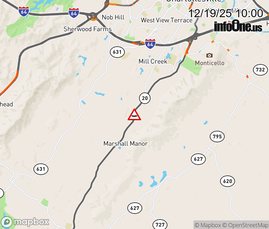 On VA-20 in the County of Albemarle, in the vicinity of Avon Street Ext; Rt. 742N/S (Albemarle County), motorists can expect delays due to a vehicle crash. All south lanes are closed. Updated: Fri 12/19/25 10:00 AM EST ![]() Updated: Fri 12/19/25 10:00 AM EST |