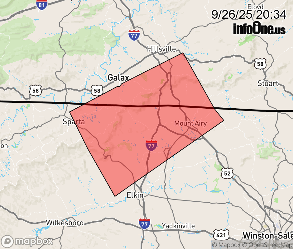 Canceled 9/26/25 11:30 PM Flood Advisory issued September 26 at 8:32PM EDT until September 26 at 11:30PM EDT by NWS Blacksburg VA * WHAT... Flooding caused by excessive rainfall is expected. * WHERE... Portions of North Carolina, including the following counties, Alleghany NC, Surry and Wilkes and southwest Virginia, including the following counties, Carroll, Grayson and Patrick. * WHEN... Until 1130 PM EDT. * IMPACTS... Minor flooding in low-lying and poor drainage areas. * ADDITIONAL DETAILS... - At 831 PM EDT, Doppler radar indicated heavy rain due to thunderstorms. Minor flooding is ongoing or expected to begin shortly in the advisory area. Between 1 and 2 inches of rain have fallen. - This includes the following streams and drainages... Big Bugaboo Creek, Beaver Creek, Ararat River, Big Pine Creek, Beaverdam Creek, Big Creek and Archies Creek. Additional rainfall amounts up to 1 inch are expected over the area. This additional rain will result in minor flooding. - Some locations that will experience flooding include... Mount Airy... Galax... Elkin... Flat Rock... Sparta... Dobson... Bottom... - http://www.weather.gov/safety/flood ![]() |