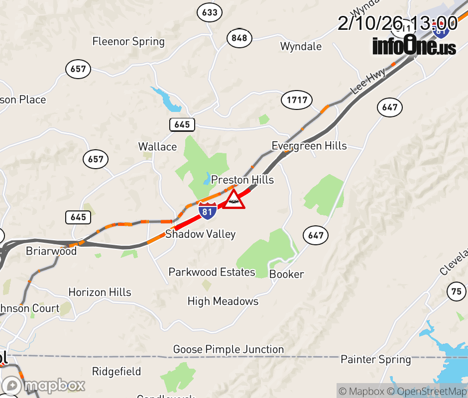 On I-81 at mile marker 8.7 in the County of Washington, motorists can expect delays due to a tractor trailer crash. The north left shoulder and left lane are closed. Traffic backups are approximately 1.0 mile. Updated: Tue 2/10/26 1:00 PM EST ![]() Updated: Tue 2/10/26 1:00 PM EST |