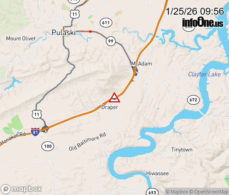On I-81 at mile marker 93 in the County of Pulaski, motorists can expect delays due to a tractor trailer crash. The south right lane and right shoulder are closed. Updated: Sun 1/25/26 9:56 AM EST ![]() Updated: Sun 1/25/26 9:56 AM EST |