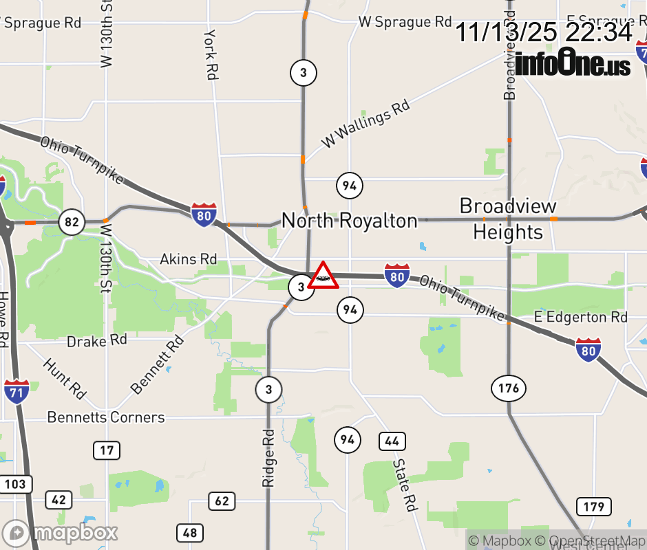 Expect lane closures on I-80 West (Ohio Turnpike) beyond I-77, due to a crash. ![]() |