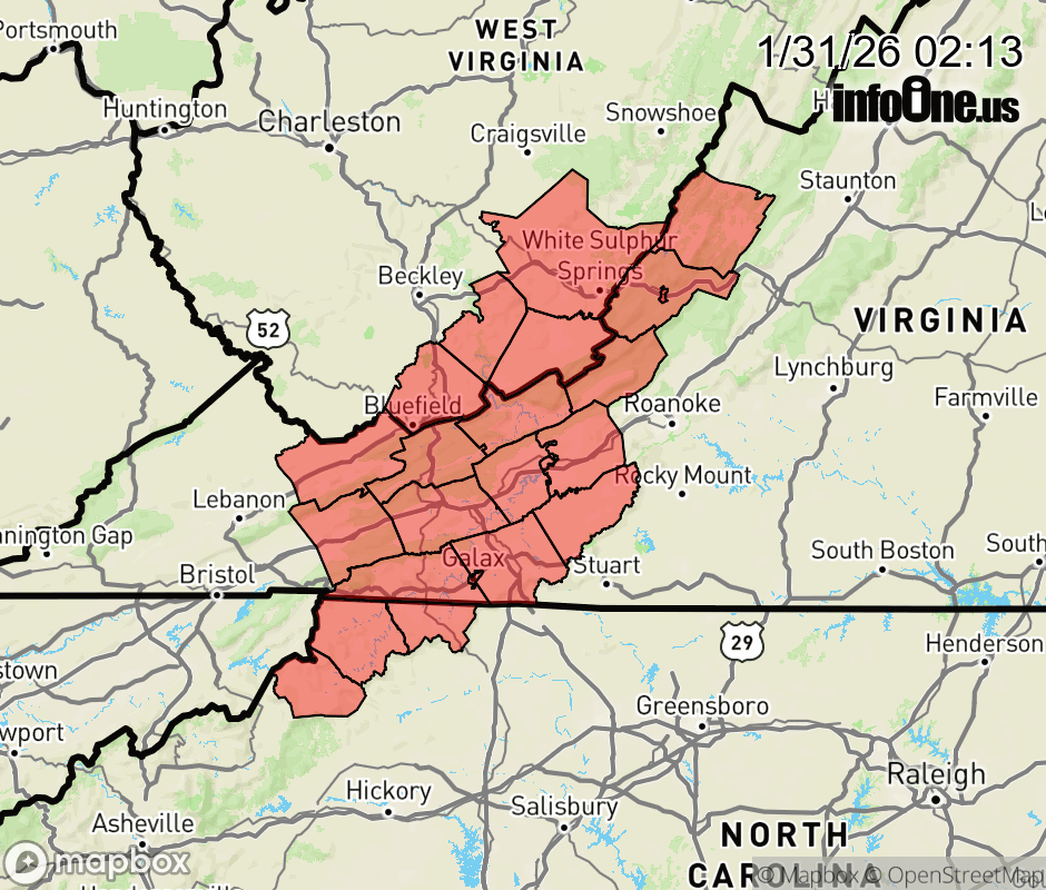 Canceled 1/31/26 10:12 AM Extreme Cold Warning issued January 31 at 2:12AM EST until February 1 at 1:00PM EST by NWS Blacksburg VA * WHAT... Dangerously cold wind chills as low as 19 below expected. * WHERE... Portions of northwest North Carolina, southwest and west central Virginia, and southeast West Virginia. * WHEN... From 1 PM this afternoon to 1 PM EST Sunday. * IMPACTS... The dangerously cold wind chills as low as 20 below zero could cause frostbite on exposed skin in as little as 30 minutes. Hypothermia will occur if unprotected skin is exposed to these temperatures. ![]() |