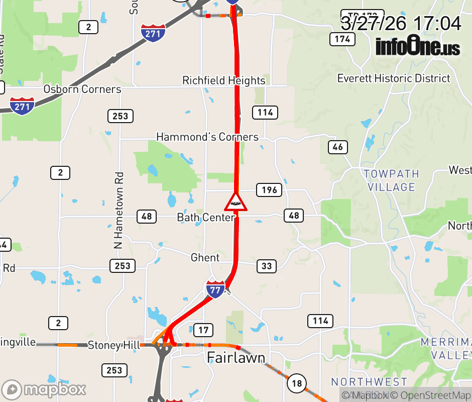 The left lane is closed on I-77 South beyond Summit County Rest Area 4-32, due to a crash. Updated: Fri 3/27/26 5:04 PM EDT ![]() Updated: Fri 3/27/26 5:04 PM EDT |