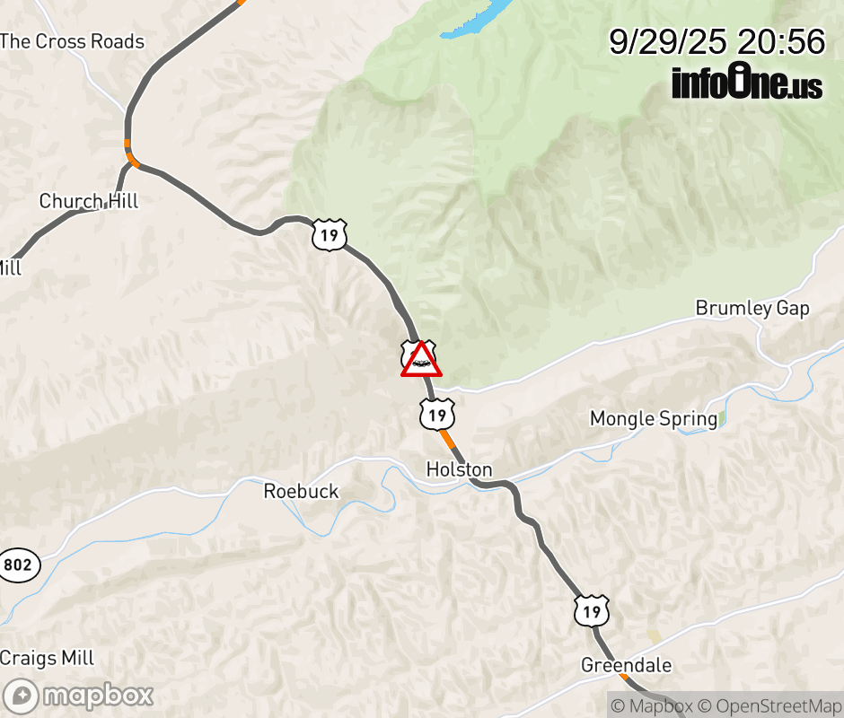 On US-19 in the County of Washington, in the vicinity of Brumley Gap Rd; Porterfield Hwy; Rt. 689E/W (Washington County), motorists can expect delays due to a vehicle crash. The north right lane and right shoulder are closed.