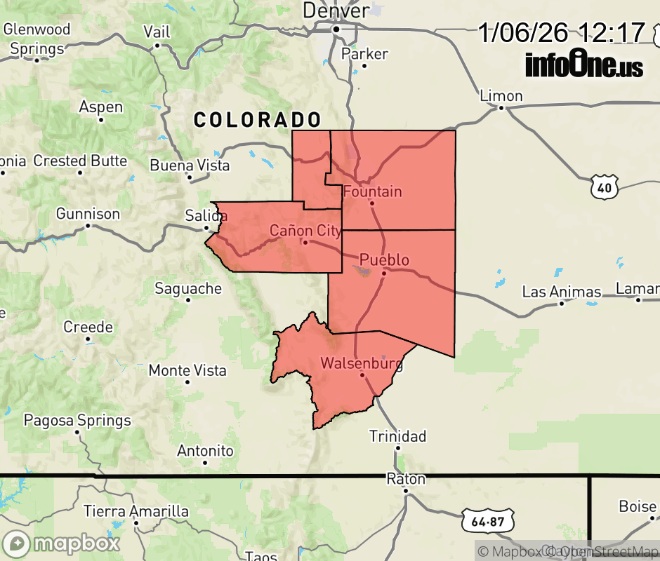 Canceled 1/6/26 3:52 PM Red Flag Warning issued January 6 at 10:16AM MST until January 6 at 5:00PM MST by NWS Pueblo CO The National Weather Service in Pueblo has issued a Red Flag Warning for gusty winds and low relative humidity, which is in effect until 5 PM MST this afternoon. * AFFECTED AREA... Fire Weather Zones 221, 222, 226, 227, 228 and 229. * WINDS... Southwest 15 to 25 mph with gusts up to 40 mph. * RELATIVE HUMIDITY... As low as 13 percent. * IMPACTS... Fires will catch and spread quickly. Exercise extreme caution with any outdoor burning. ![]() |