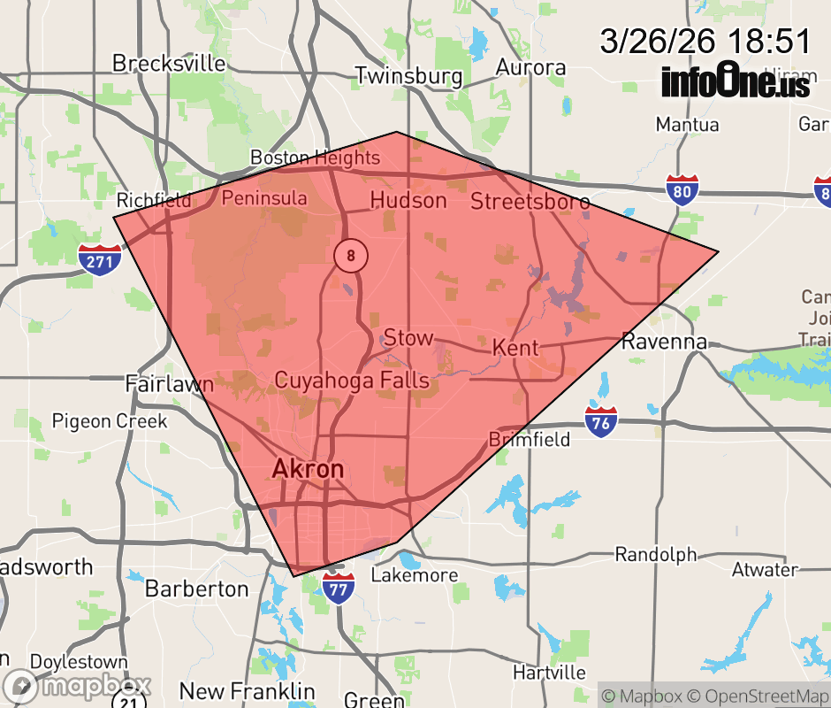 Canceled 3/26/26 7:02 PM Severe Thunderstorm Warning issued March 26 at 6:50PM EDT until March 26 at 7:30PM EDT by NWS Cleveland OH At 650 PM EDT, severe thunderstorms were located along a line extending from 6 miles northwest of Cuyahoga Falls to 8 miles southeast of Brunswick to near Medina, moving east at 20 mph. HAZARD...60 mph wind gusts. SOURCE...Radar indicated. IMPACT...Expect damage to trees and power lines. Locations impacted include... Akron, Ravenna, Cuyahoga Falls, Kent, Hudson, Tallmadge, Streetsboro, Stow, Brimfield, Fairlawn, Munroe Falls, Richfield, Silver Lake, Boston Heights, Peninsula, Brady Lake, Sugar Bush Knolls, Montrose-Ghent, and Portage Lakes. ![]() |