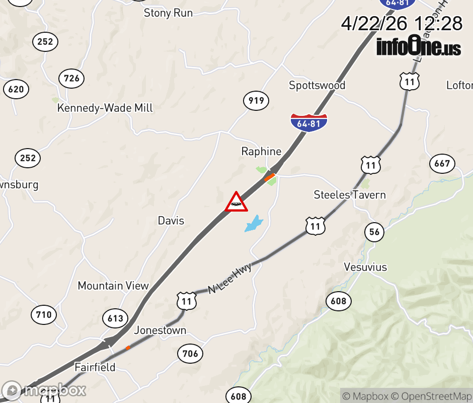 On I-81 at mile marker 204.2 in the County of Rockbridge, motorists can expect delays due to a tractor trailer crash. The south right shoulder is closed. ![]() |