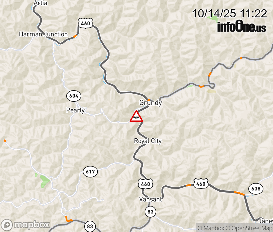 On Rt. 615 East in the County of Buchanan, in the vicinity of Hoot Owl Rd; Riverside Dr; VA-83E/W, US-460E/W, motorists can expect delays due to a tractor trailer crash. Lane closures exist. ![]() |