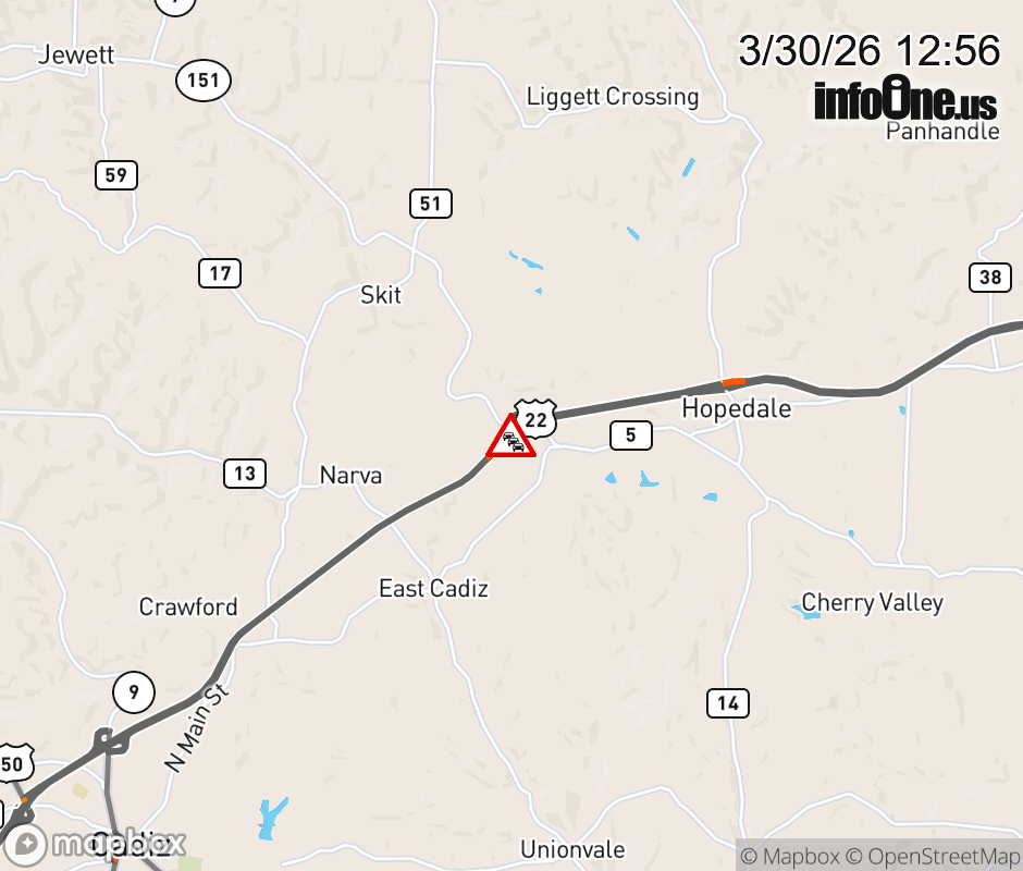 US-22 CLOSED in BOTH DIRECTIONS from County Line Rd to 0.2 miles beyond SR-151/Jewett Hopedale Rd (MM: 25.2), due to police incident. Use alternate route. ![]() |