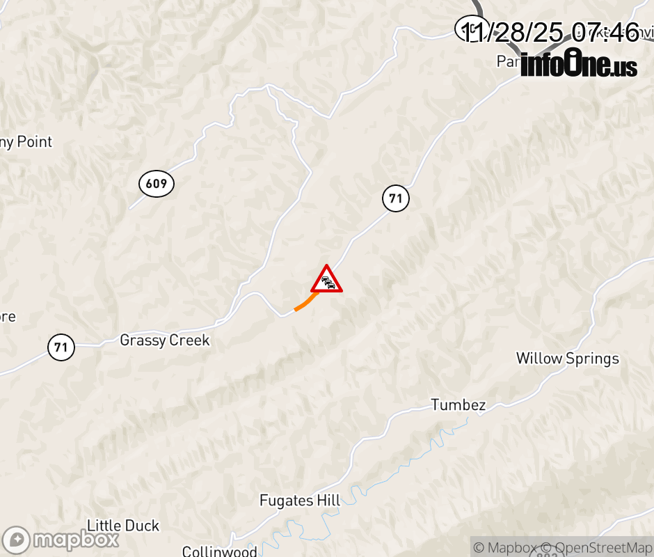 On VA-71 in the County of Russell, in the vicinity of Caney Boyd Ln; Rt. 680N/S (Russell County), motorists can expect delays due to a vehicle fire. All west lanes are closed. Updated: Fri 11/28/25 7:46 AM EST ![]() |