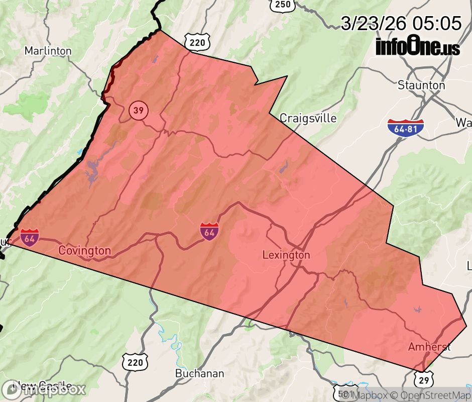 Canceled 3/23/26 5:43 AM Severe Thunderstorm Warning issued March 23 at 5:04AM EDT until March 23 at 5:45AM EDT by NWS Blacksburg VA SVRRNK The National Weather Service in BLACKSBURG has issued a * Severe Thunderstorm Warning for... The City of Covington in west central Virginia... Northern Alleghany County in west central Virginia... The City of Buena Vista in west central Virginia... The City of Lexington in west central Virginia... Rockbridge County in west central Virginia... Bath County in west central Virginia... North central Botetourt County in west central Virginia... Northern Amherst County in central Virginia... * Until 545 AM EDT. * At 503 AM EDT, severe thunderstorms were located along a line extending from Burnsville to Ingalls Field to near Covington, moving east at 75 mph. HAZARD...60 mph wind gusts. SOURCE...Radar indicated. IMPACT...Expect damage to roofs, siding, and trees. * Locations impacted include... Lexington... Buena Vista... Covington... Clifton Forge... Amherst... Glasgow... and Goshen. ![]() |