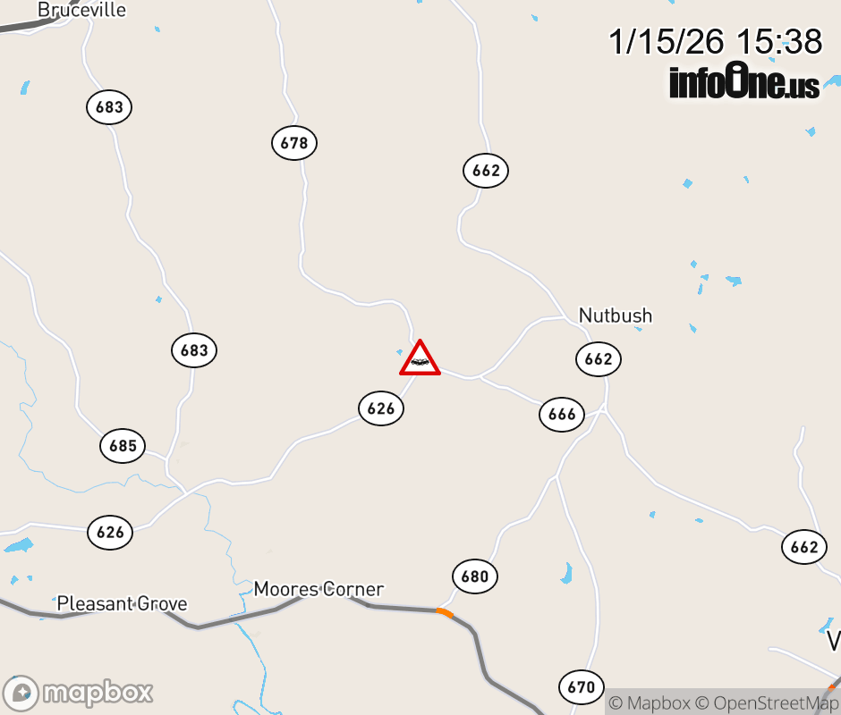 On Rt. 678 in the County of Lunenburg, in the vicinity of Double Bridges Rd; Rt. 626E/W (Lunenburg County), motorists can expect delays due to a vehicle crash. All north lanes are closed. All south lanes are closed. ![]() |