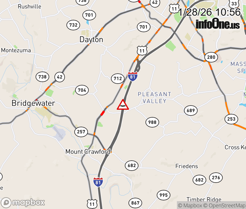 On I-81 at mile marker 241.8 in the County of Rockingham, motorists can expect delays due to a vehicle crash. The south right shoulder is closed. Updated: Wed 1/28/26 10:56 AM EST ![]() Updated: Wed 1/28/26 10:56 AM EST |