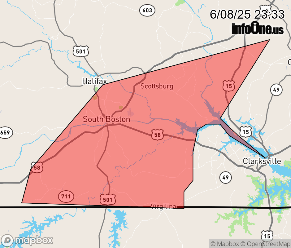 Canceled 6/8/25 11:47 PM Severe Thunderstorm Warning issued June 8 at 11:31PM EDT until June 9 at 12:00AM EDT by NWS Blacksburg VA At 1130 PM EDT, severe thunderstorms were located along a line extending from near Wylliesburg to near Cluster Springs, moving east at 40 mph. HAZARD...60 mph wind gusts. SOURCE...Radar indicated. IMPACT...Expect damage to roofs, siding, and trees. Locations impacted include... South Boston... Halifax... Redoak... Turbeville... Scottsburg... Hitesburg... and Cluster Springs. ![]() |