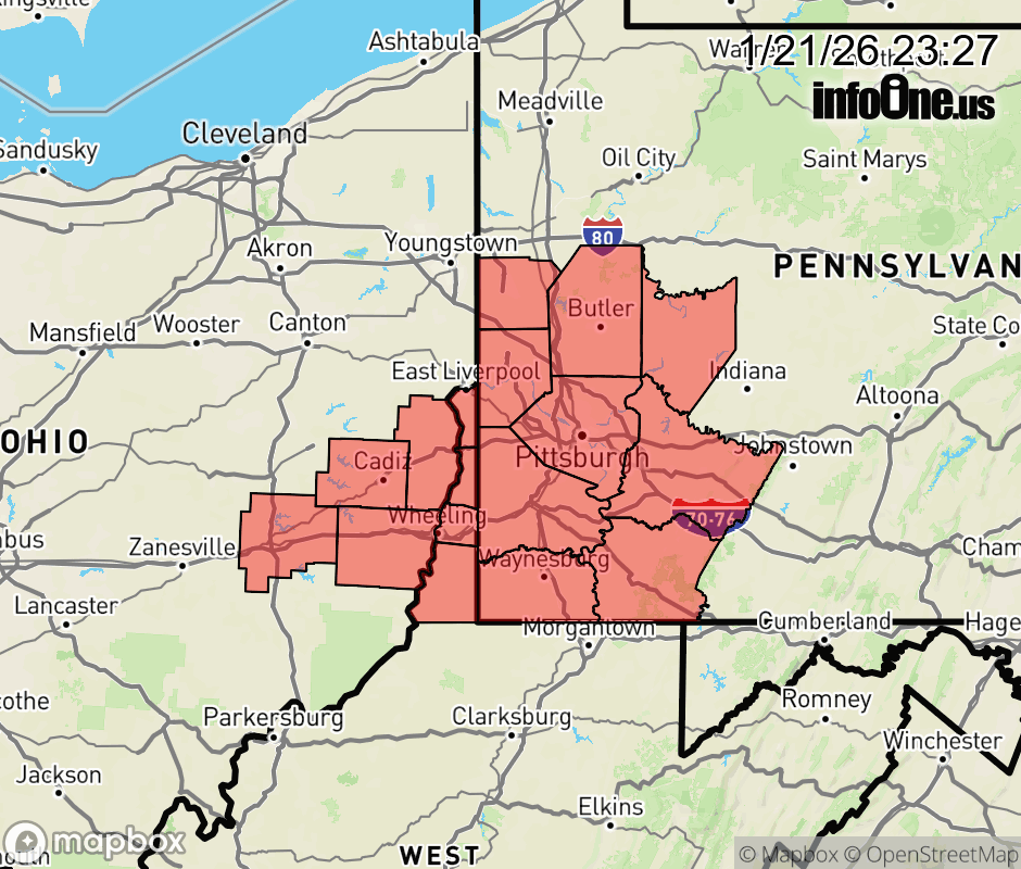 Canceled 1/22/26 6:00 AM Special Weather Statement issued January 21 at 11:26PM EST by NWS Pittsburgh PA Given the recent cold spell, observed roadway surface temperatures are still below freezing even though air temperatures are above freezing. This will result in patchy ice along area roadways leading to hazardous travel conditions, especially secondary roadways that may be untreated. Motorists are advised to use caution while traveling. ![]() |