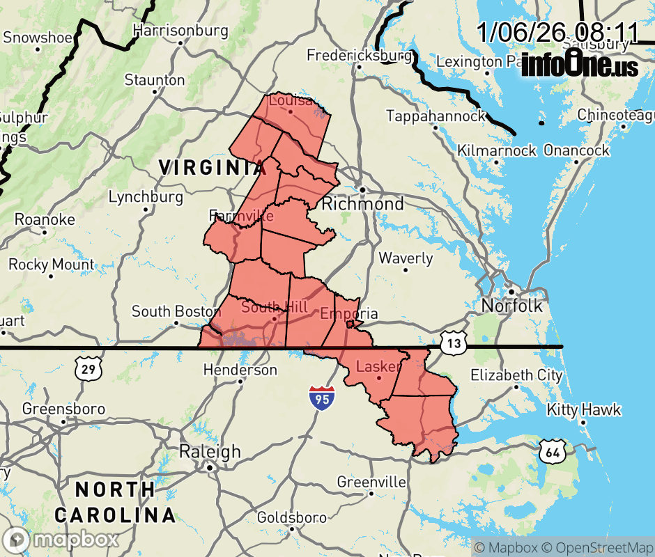 Canceled 1/6/26 10:00 AM Special Weather Statement issued January 6 at 8:09AM EST by NWS Wakefield VA Areas of locally dense fog have developed across the Virginia Piedmont and interior portions of northeast North Carolina this morning. Visibility will generally be reduced to one half to one mile, but will locally be reduced to a quarter mile or less. The fog should lift by 10 AM. Motorists should be alert for sudden changes in visibility due to the areas of dense fog. Drive at reduced speeds, watch for children at school bus stops, and use low beam headlights only. ![]() |