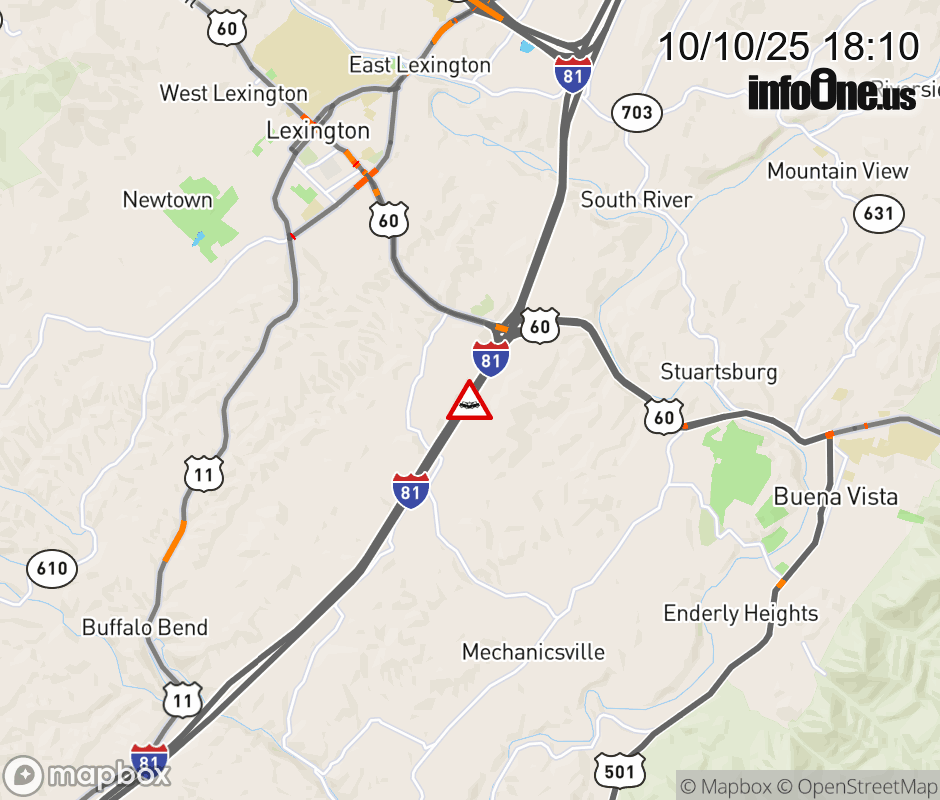 On I-81 at mile marker 188 in the County of Rockbridge, motorists can expect delays due to a vehicle crash. The north right shoulder is closed. Traffic backups are approximately 1.0 mile. Updated: Fri 10/10/25 6:10 PM EDT ![]() Updated: Fri 10/10/25 6:10 PM EDT |