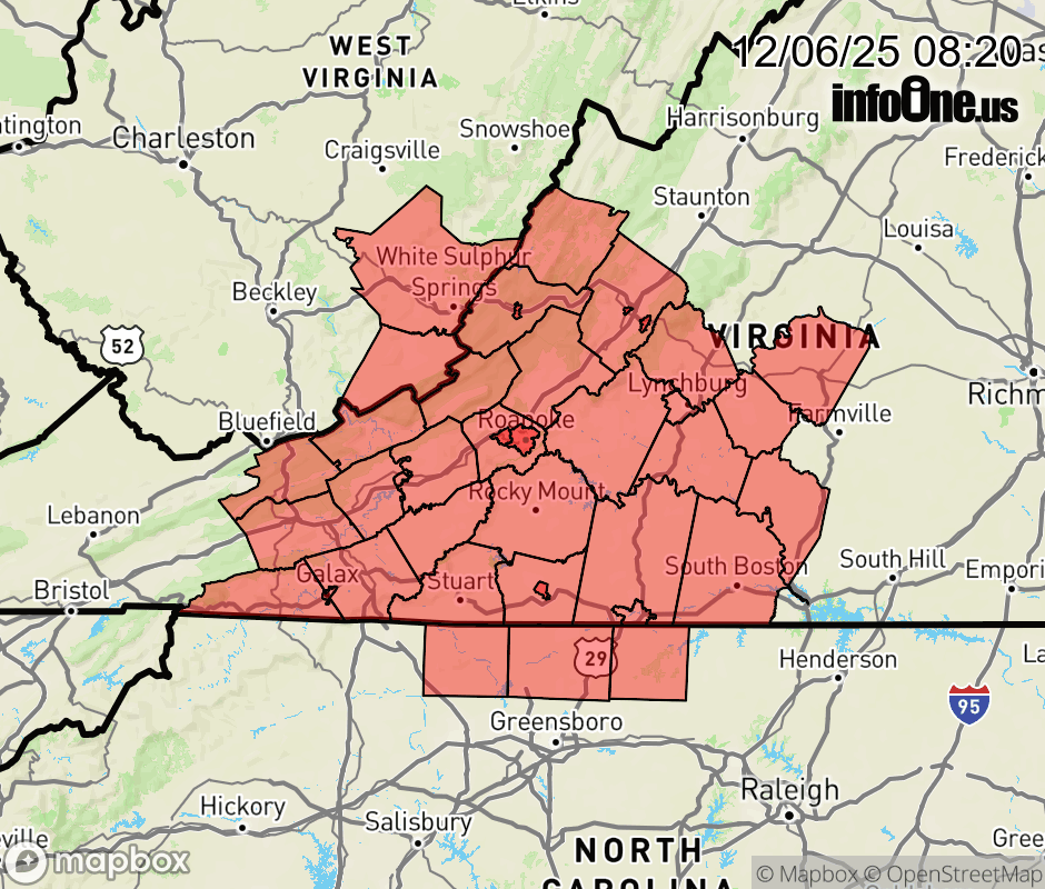 Canceled 12/6/25 10:30 AM Special Weather Statement issued December 6 at 8:19AM EST by NWS Blacksburg VA Temperatures across the region remain around, or just below freezing this morning. Patchy areas of freezing fog, which developed prior to sunrise, will continue to be seen through late this morning. Some of the fog could be locally dense, with quick reductions in visibilities to under a quarter mile and may result in icing on elevated objects and car windshields. Additionally, patchy ice may continue to be seen on untreated roads, as well as parking lots and sidewalks. Temperatures are expected to warm above freezing later this morning, decreasing the risk of freezing fog and black ice. For your safety, prepare accordingly. If traveling, please slow down, and leave plenty of room between you and the vehicle in front of you. If you venture outdoors, use extra caution when walking. Ice on sidewalks and steps will be hard to see. Additional statements will be issued as conditions warrant. ![]() |