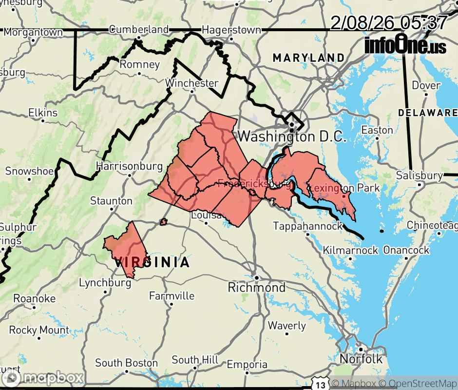 Canceled 2/8/26 9:39 AM Cold Weather Advisory issued February 8 at 5:35AM EST until February 8 at 10:00AM EST by NWS Baltimore MD/Washington DC * WHAT... Very cold wind chills as low as 5 below. * WHERE... Portions of southern Maryland and central, northern, and northwest Virginia. * WHEN... Until 10 AM EST this morning. ![]() |