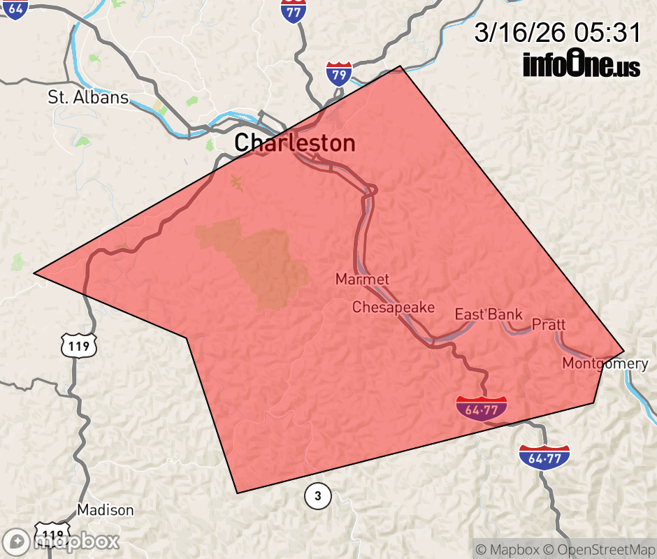 Canceled 3/16/26 5:44 AM Severe Thunderstorm Warning issued March 16 at 5:30AM EDT until March 16 at 5:45AM EDT by NWS Charleston WV At 530 AM EDT, a severe thunderstorm was located near Marmet, or 8 miles southwest of Charleston, moving northeast at 45 mph. HAZARD...60 mph wind gusts. SOURCE...Radar indicated. IMPACT...Expect damage to roofs, siding, and trees. Locations impacted include... Charleston, South Charleston, Montgomery, Chesapeake, Marmet, Belle, Cedar Grove, East Bank, Glasgow, Pratt, Coal Fork, Alum Creek, Handley, Seth, Dawes, Ashford, Sharon, Racine, and Sod. ![]() |