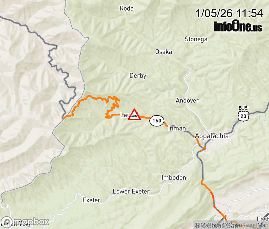 On VA-160 in the County of Wise, in the vicinity of County/City/Town Line: APPALACHIA, motorists can expect delays due to a disabled tractor trailer. All east lanes are closed. All west lanes are closed. ![]() |