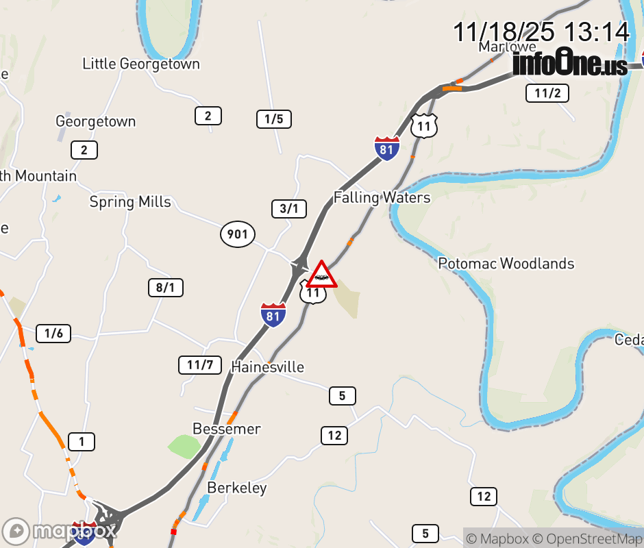 Vehicle Crash on US-11 (Williamsport Pike at Hammonds Mill Road). Updated: Tue 11/18/25 1:14 PM EST ![]() Updated: Tue 11/18/25 1:14 PM EST |