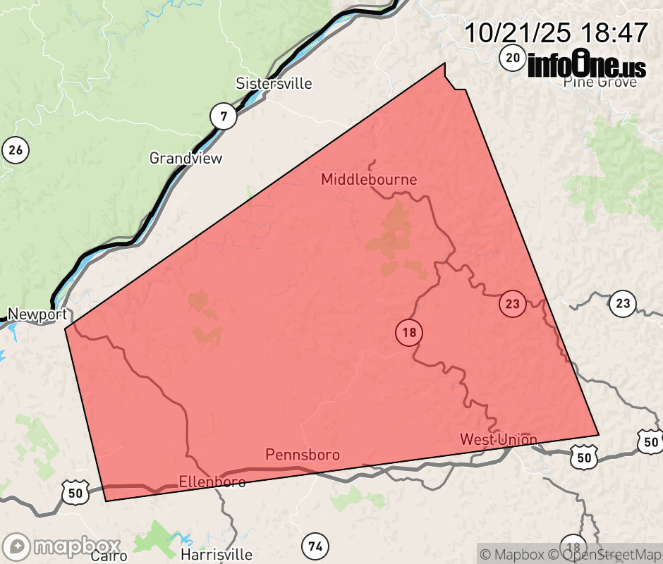 Canceled 10/21/25 7:15 PM Special Weather Statement issued October 21 at 6:46PM EDT by NWS Charleston WV At 645 PM EDT, Doppler radar was tracking a strong thunderstorm 7 miles northwest of Pennsboro, or 8 miles east of St. Marys, moving northeast at 35 mph. HAZARD...Wind gusts up to 40 mph and pea size hail. SOURCE...Radar indicated. IMPACT...Gusty winds could knock down tree limbs and blow around unsecured objects. Minor hail damage to vegetation is possible. Locations impacted include... Middlebourne, Pennsboro, West Union, Ellenboro, Alma, Maxwell, Arvilla, Wick, Mountain, Hebron, Pike, Canton, and Highland. This includes Route 50 in West Virginia between mile markers 31 and 42, and between mile markers 54 and 55. ![]() |