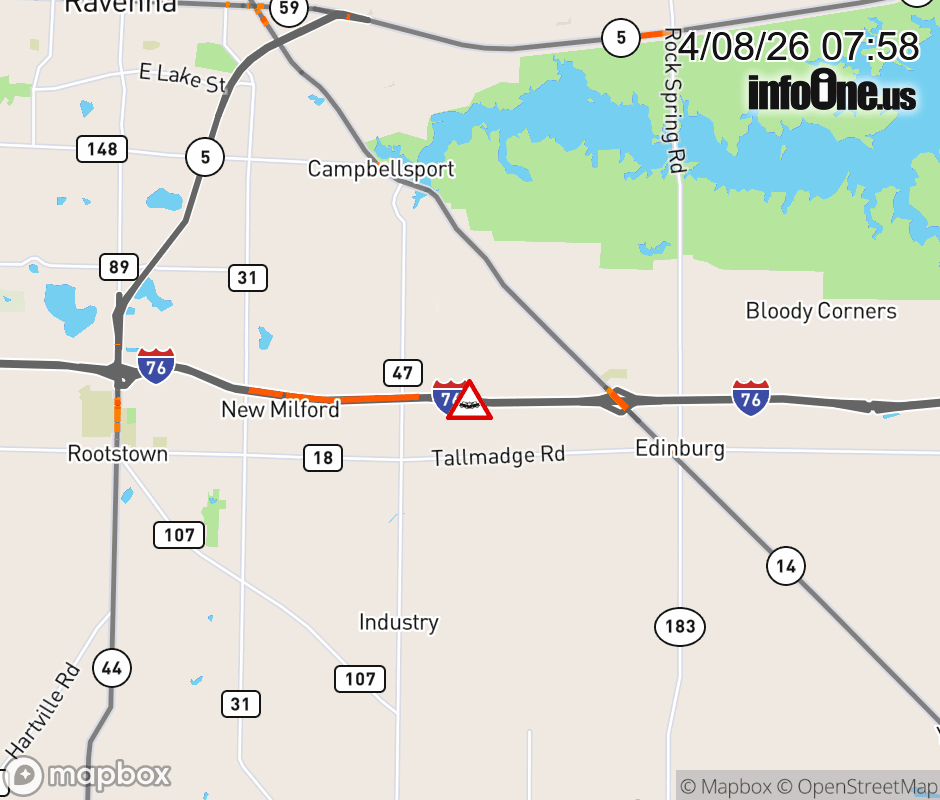 Expect lane closures on I-76 West beyond SR-14/Alliance/Ravenna, due to a crash. ![]() |