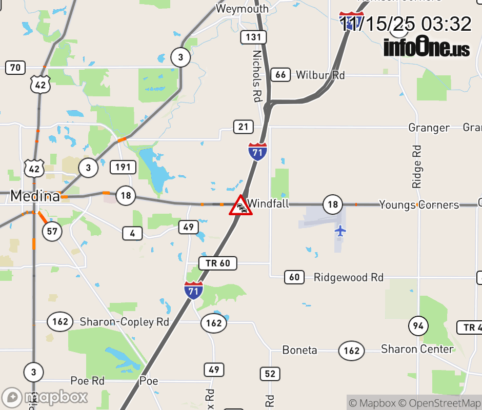 The 3 left lanes are blocked on SR-18 East at Montville Dr the left lane is blocked on SR-18 West at Gateway Dr, due to repairs/maintenance. Updated: Sat 11/15/25 3:32 AM EST ![]() Updated: Sat 11/15/25 3:32 AM EST |