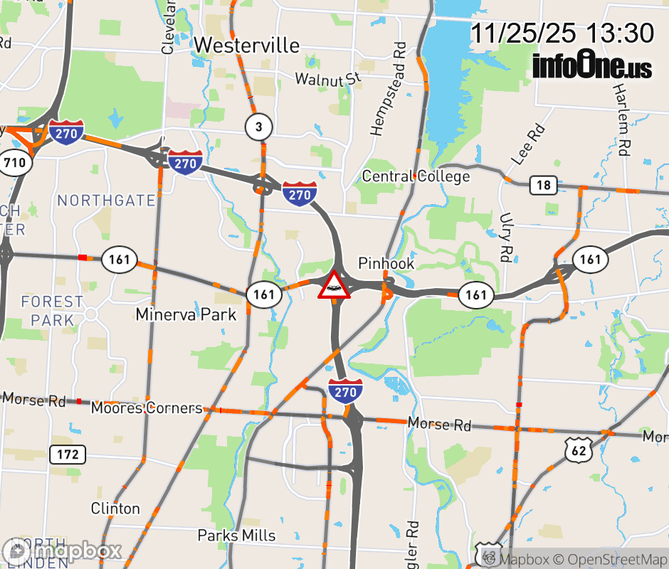 The left lane is blocked on Ramp SR-161 West to I-270 South, due to a crash. ![]() |