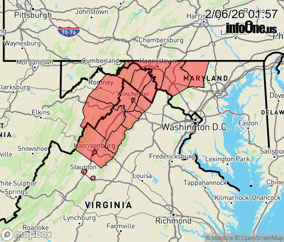 Canceled 2/6/26 2:21 AM Cold Weather Advisory issued February 6 at 1:55AM EST until February 9 at 10:00AM EST by NWS Baltimore MD/Washington DC * WHAT... For the High Wind Warning, northwest winds 20 to 30 mph with gusts up to 60 mph expected. For the Cold Weather Advisory, very cold wind chills as low as 15 below expected. * WHERE... Portions of north central Maryland, northwest and western Virginia, and eastern West Virginia. * WHEN... For the High Wind Warning, from 4 AM to 7 PM EST Saturday. For the Cold Weather Advisory, from 4 AM Saturday to 10 AM EST Monday. * IMPACTS... Damaging winds will blow down trees and power lines. Power outages are expected. Travel will be difficult, especially for high profile vehicles. The cold wind chills could result in hypothermia or frostbite if precautions are not taken. * ADDITIONAL DETAILS... Wind chills will remain at or below zero during the day on Saturday due to windy conditions and cold temperatures. ![]() |