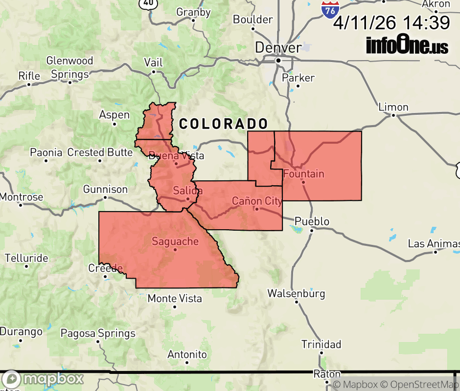 Canceled 4/12/26 2:14 AM Fire Weather Watch issued April 11 at 12:37PM MDT until April 13 at 9:00PM MDT by NWS Pueblo CO The National Weather Service in Pueblo has issued a Fire Weather Watch for gusty winds and low relative humidity, which is in effect from Monday morning through Monday evening. * AFFECTED AREA... Fire Weather Zones 220 and 221. * TIMING... For the Red Flag Warning, from 11 AM to 9 PM MDT Sunday. For the Fire Weather Watch, from Monday morning through Monday evening. * WINDS... Southwest 20 to 30 mph with gusts up to 45 mph. * RELATIVE HUMIDITY... 10 to 15 percent. * IMPACTS... Fires will catch and spread quickly. Exercise extreme caution with any outdoor burning. ![]() |