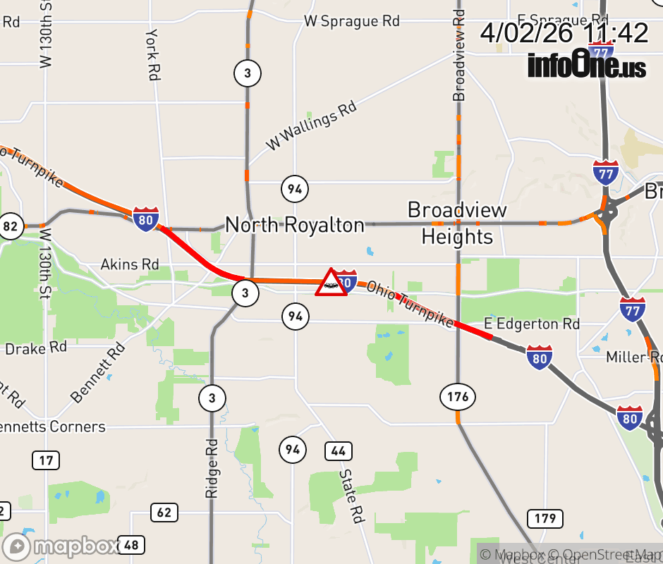 Expect lane closures on I-80 West (Ohio Turnpike) beyond I-77, due to a crash. ![]() |