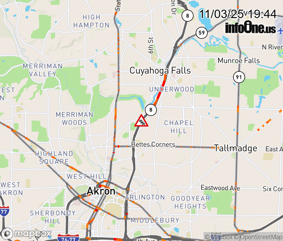 The right lane is blocked on SR-8 North/SR-59 East at Cuyahoga Falls Ave, due to repairs/maintenance. ![]() |