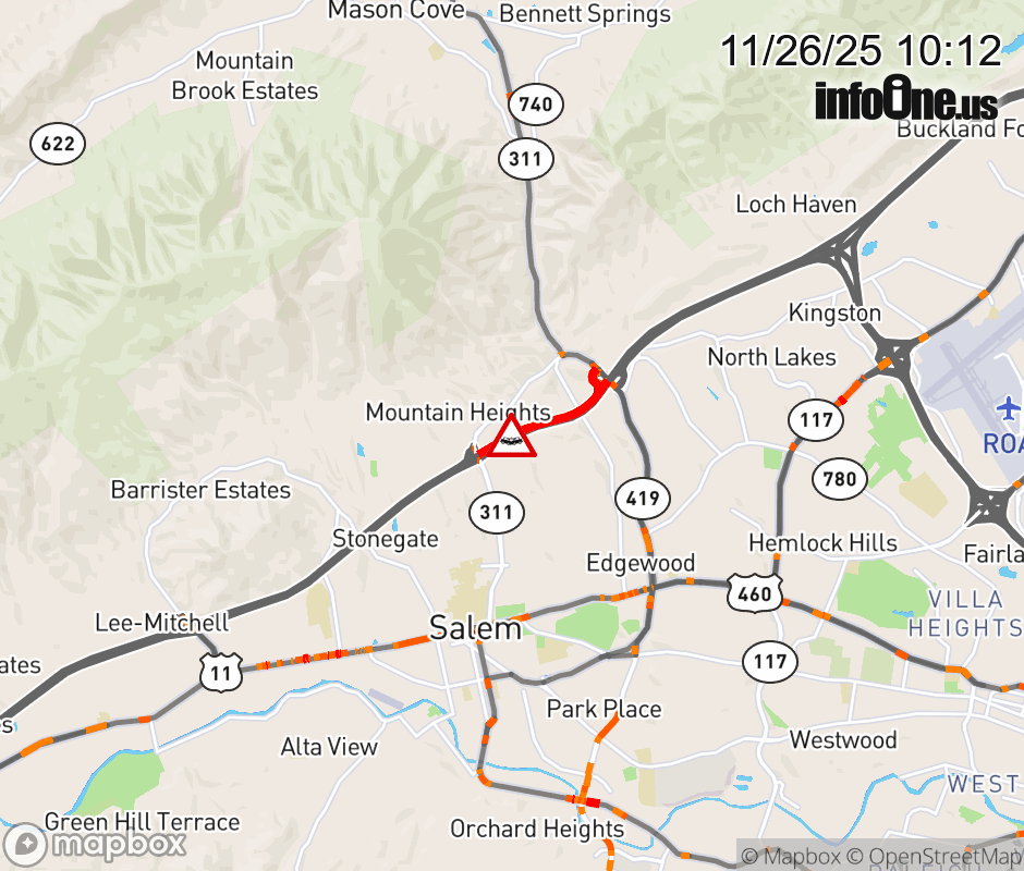 On I-81 at mile marker 140.6 in the County of Roanoke, motorists can expect delays due to a tractor trailer crash. The south center lane, right lane, and right shoulder are closed. Updated: Wed 11/26/25 10:12 AM EST ![]() Updated: Wed 11/26/25 10:12 AM EST |