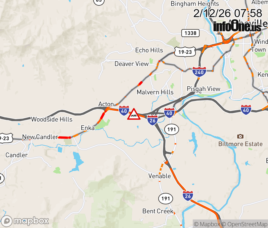 The left lane is closed 1.5 miles east of Exit 44, US 19/US 23/US 74 Alternate (Smokey Park Highway). ![]() |
