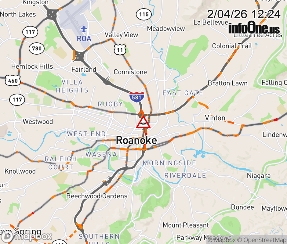 On I-581 North at mile marker 0.9 in the County of Roanoke, motorists can expect delays due to a vehicle crash. Traffic backups are approximately 0.5 mile. Updated: Wed 2/4/26 12:24 PM EST ![]() Updated: Wed 2/4/26 12:24 PM EST |