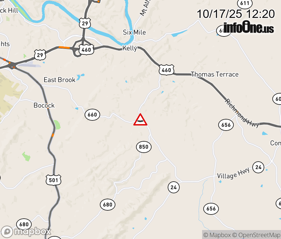 On Rt. 660 in the County of Campbell, in the vicinity of Oxford Furnace Rd; Rt. 662N/S (Campbell County), motorists can expect delays due to a vehicle crash. All east lanes are closed. All west lanes are closed. ![]() |