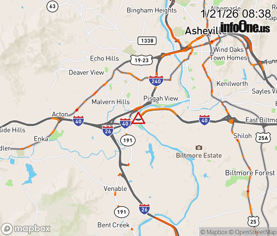 The right shoulder is closed near Exit 47, NC 191 (Brevard Road). Updated: Wed 1/21/26 8:38 AM EST ![]() Updated: Wed 1/21/26 8:38 AM EST |