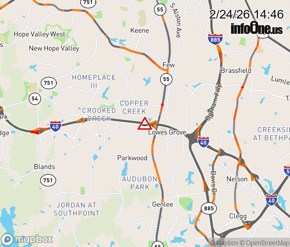 The right shoulder is closed near Exit 278 (NC 55). Updated: Tue 2/24/26 2:46 PM EST ![]() Updated: Tue 2/24/26 2:46 PM EST |
