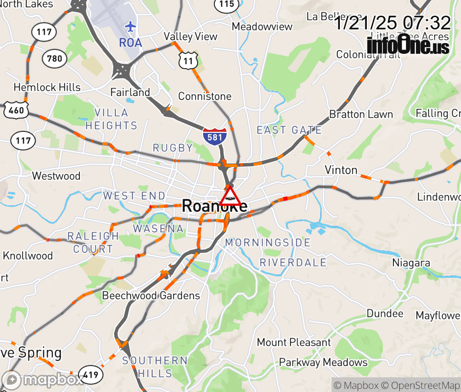 On I-581 at mile marker 0.5 in the County of Roanoke, motorists can expect delays due to a vehicle crash. The north right lane and right shoulder are closed. Updated: Tue 1/21/25 7:32 AM EST ![]() Updated: Tue 1/21/25 7:32 AM EST |