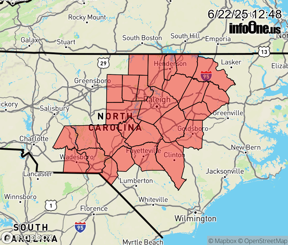 Canceled 6/22/25 1:12 PM Heat Advisory issued June 22 at 12:46PM EDT until June 24 at 10:00AM EDT by NWS Raleigh NC * WHAT... Heat index values of 104 to 109 are expected. * WHERE... A portion of the Piedmont, all of the Sandhills and all of the Coastal Plain in central North Carolina. * WHEN... From 11 AM Monday to 10 AM EDT Tuesday. * IMPACTS... Hot temperatures and high humidity may cause heat illnesses. * ADDITIONAL DETAILS... High temperatures across Central NC will be in the mid to upper 90s with some urban areas reaching 100 degrees. ![]() |