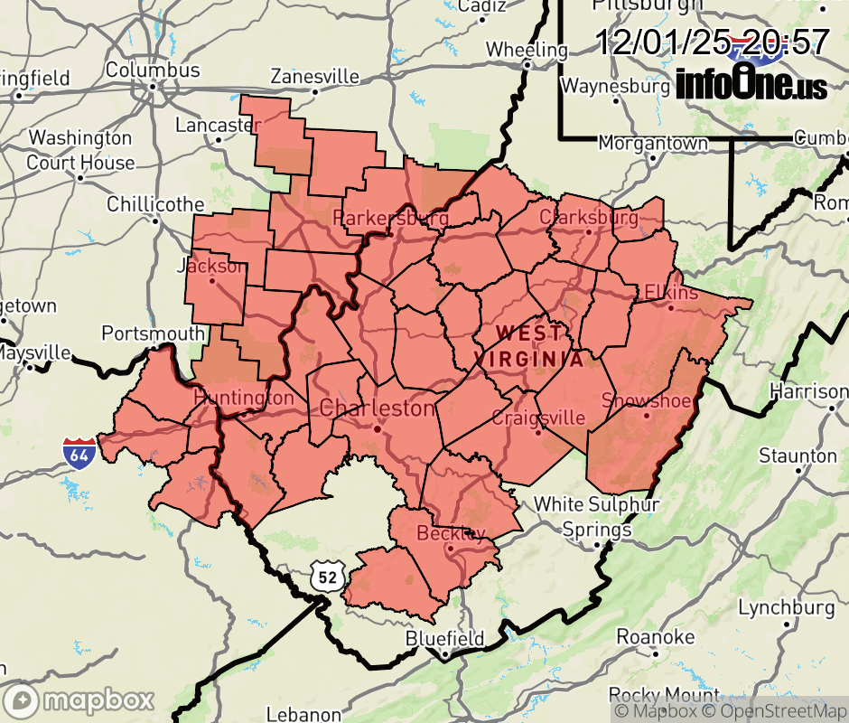 Canceled 12/2/25 5:06 AM Winter Weather Advisory issued December 1 at 8:56PM EST until December 2 at 1:00PM EST by NWS Charleston WV * WHAT... Mixed precipitation expected. Across Southeast Ohio, Northeast Kentucky, and the Mid-Ohio Valley, 1 to 3 inches of snow accumulations, along with a light glaze of ice. Across the West Virginia lowlands, up to 1 inch of snow, and a light glaze to one tenth of an inch of ice. Across the mountains of West Virginia, 1 to 3 inches of snow and up to two tenths of an inch of ice. * WHERE... Portions of northeast Kentucky, southeast Ohio, and central, northeast, northern, southeast, southern, and western West Virginia. * WHEN... Until 1 PM EST Tuesday. * IMPACTS... Plan on slippery road conditions. The hazardous conditions could impact the Tuesday morning commute. ![]() |