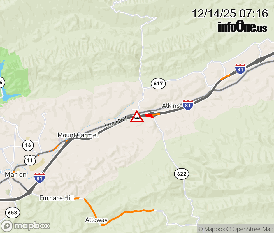 On I-81 at mile marker 50.3 in the County of Smyth, motorists can expect delays due to a vehicle crash. The north left shoulder and left lane are closed. Updated: Sun 12/14/25 7:16 AM EST ![]() Updated: Sun 12/14/25 7:16 AM EST |